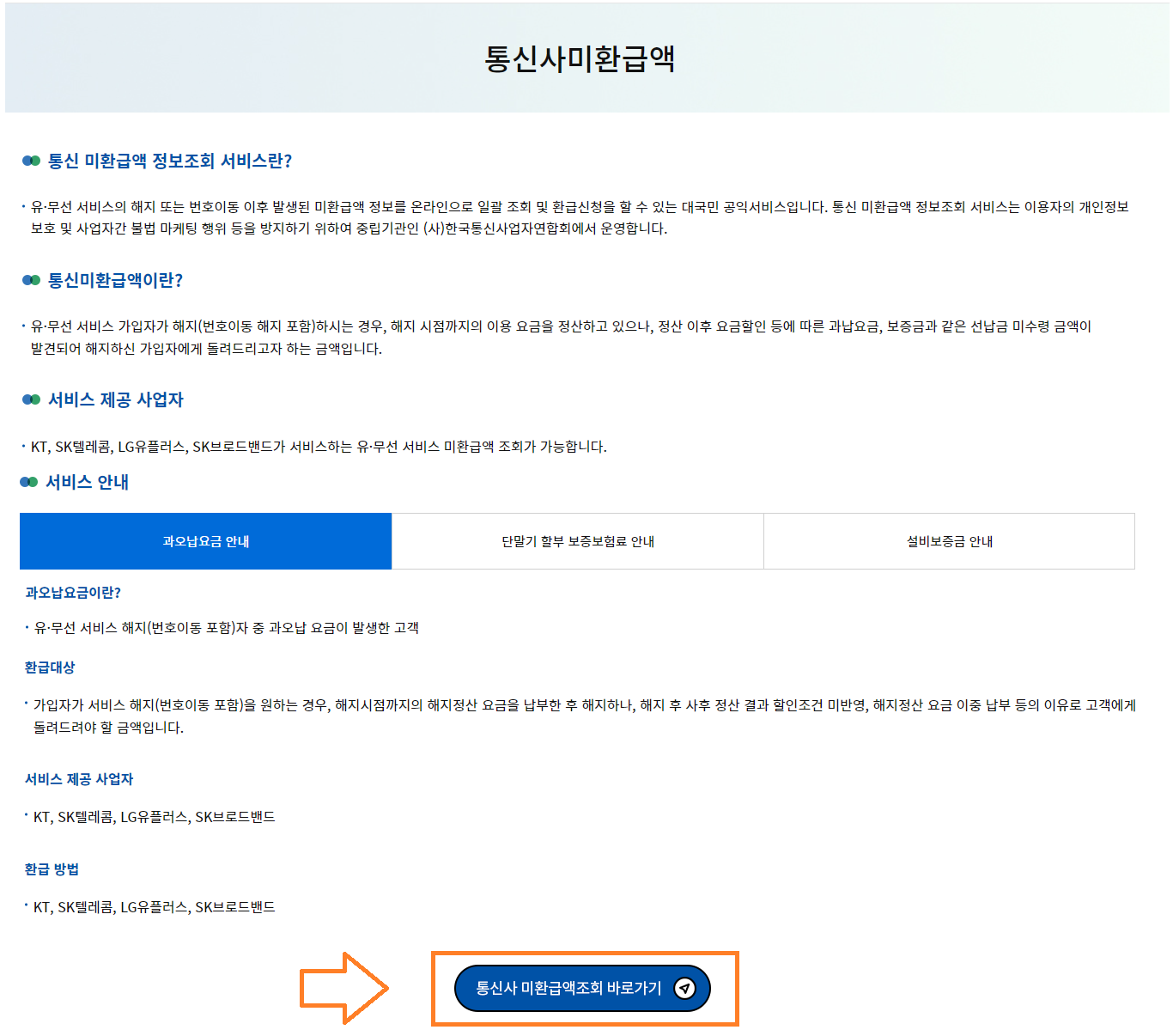 1.5 "통신사미환급액" 클릭 하면 미환급액에 대한 서비스에 대한 내용이 나오고