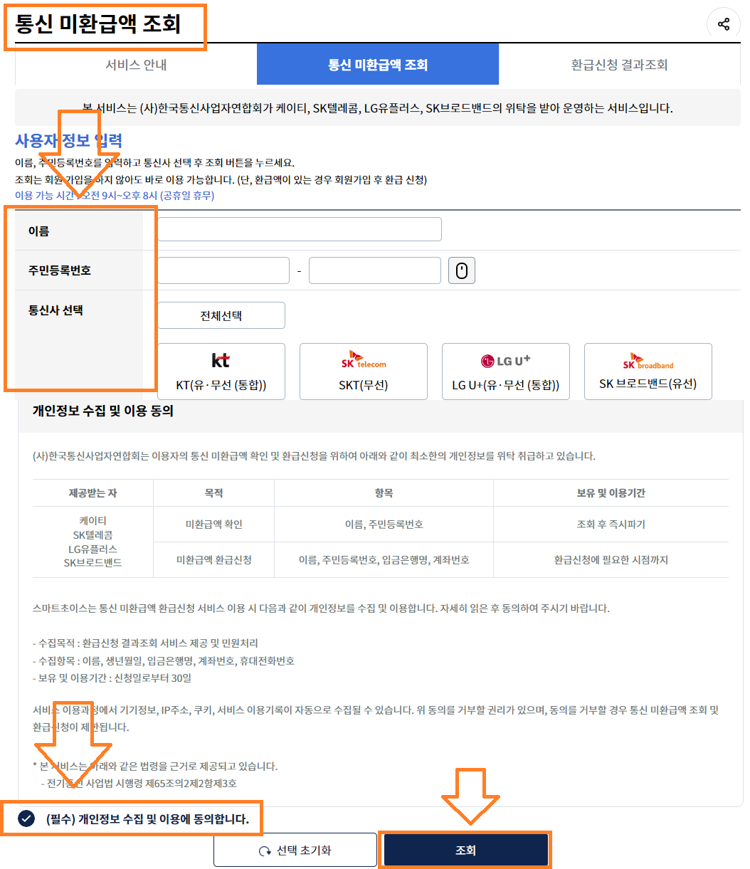 통신사 선택(KT, SKT, LG U+, SK브로드밴드 등 알뜰폰 통신사의 미환급급도 조회 가능합니다!!)