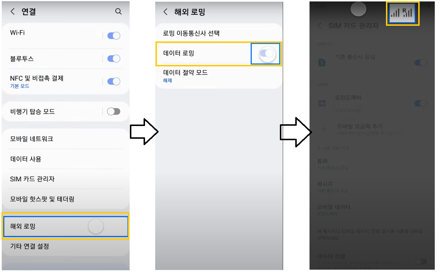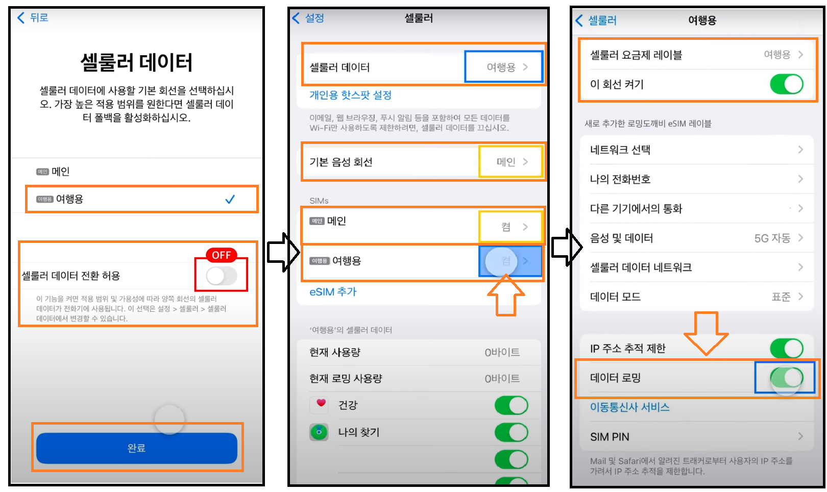 여행지 도착 후 여행용 회선을 켜고, '데이터 로밍' 'ON'
