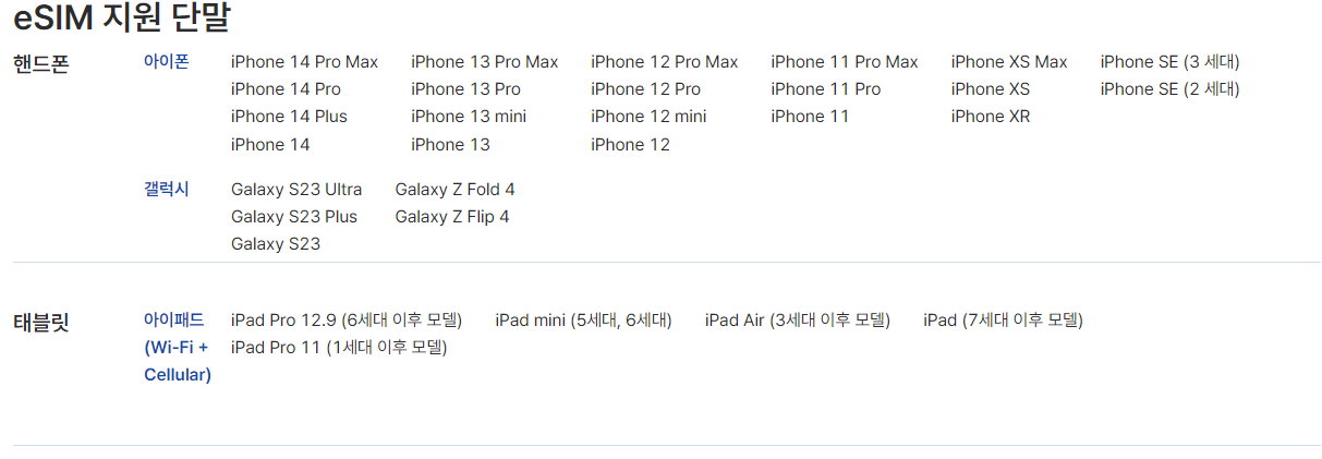 - 아이폰 : 설정 > 셀룰러 > '셀룰러 요금제 추가'(또는 'eSIM 추가') 탭이 있으면 사용 가능 기종