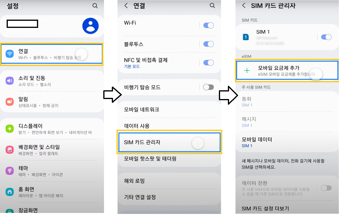 스마트폰 '설정' 메뉴에서 → '연결' 선택 → 'SIM 카드 관리자' → '모바일 요금제 추가' 버튼 클릭