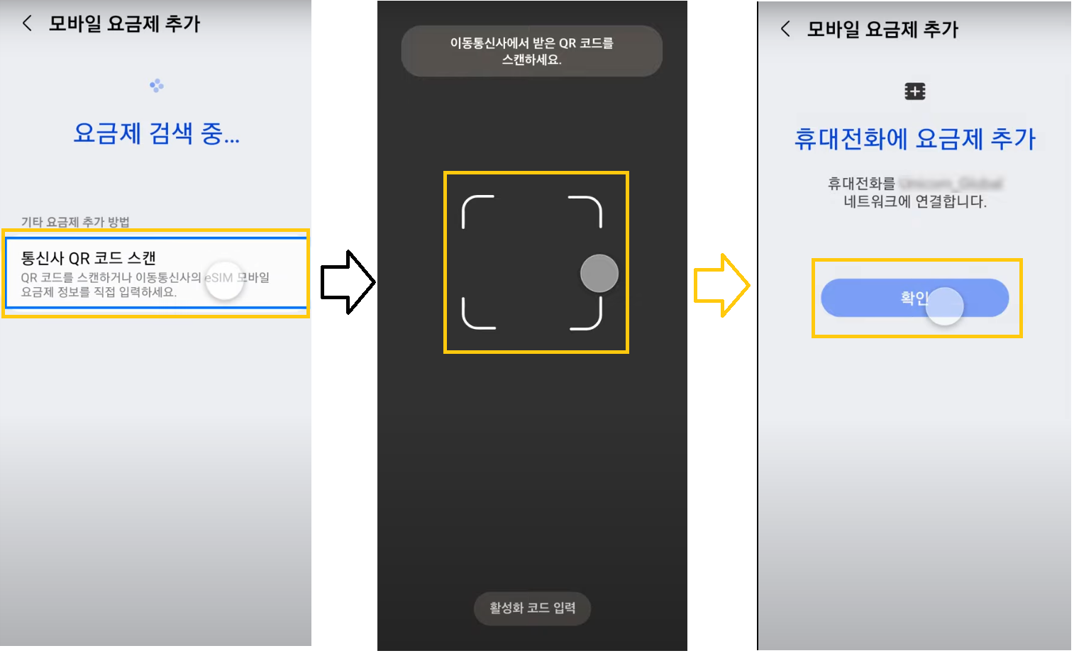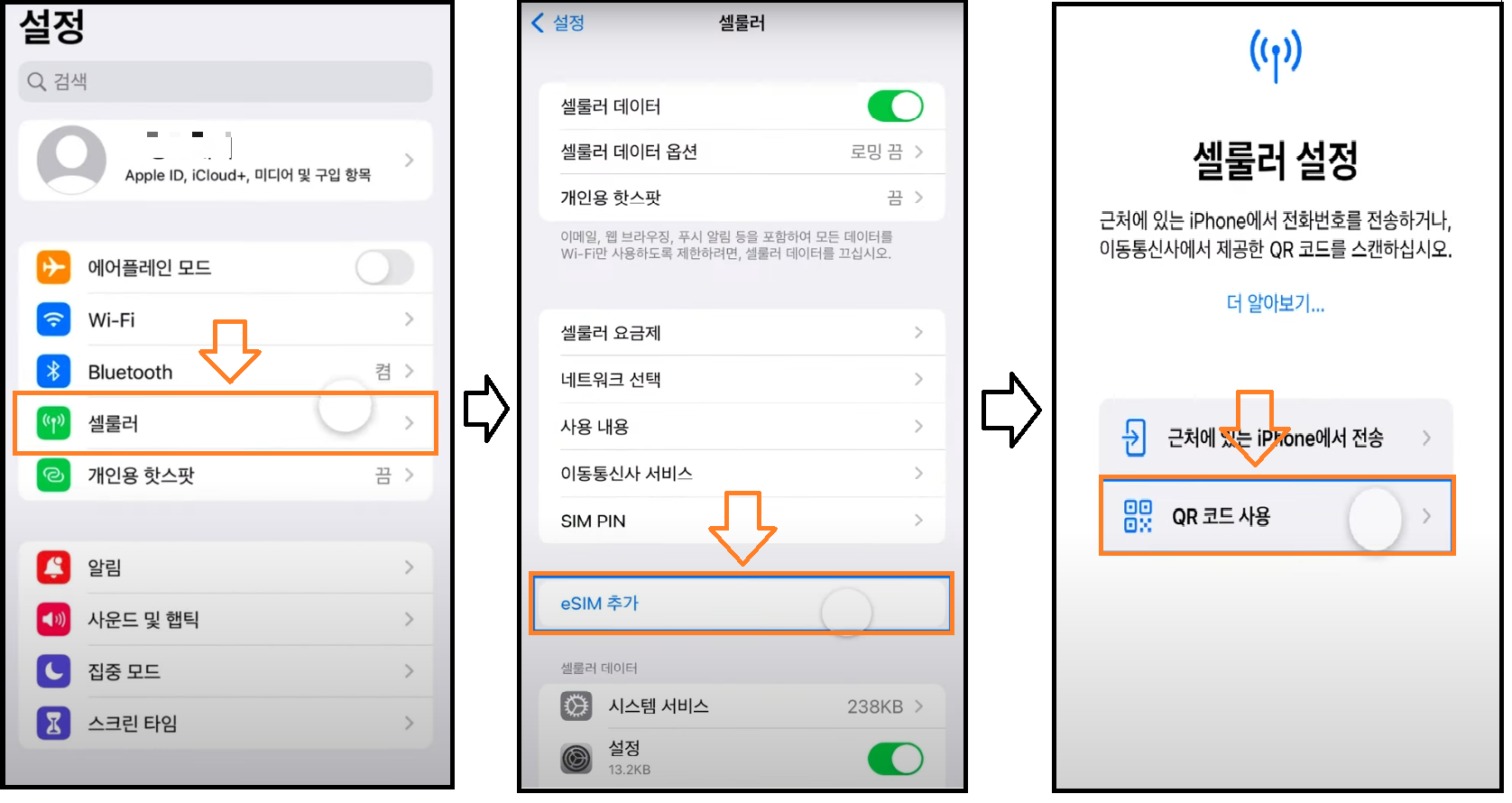 스마트폰이나 태블릿 '설정' 메뉴에서 → '셀룰러' 선택 → 'eSIM 추가' → 'QR코드 사용' 클릭