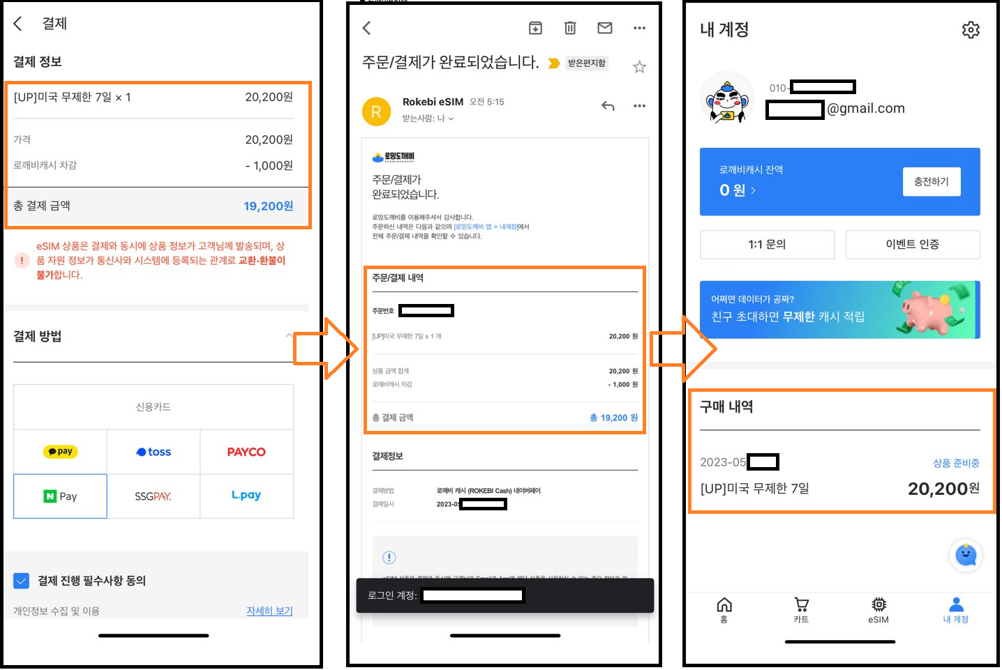 - 3.7 결제완료 2~3분 후 이메일로 'eSIM 상품 정보'와 'QR 코드', '활성화 코드/정보(애플(iOS), 안드로이드)' 발송