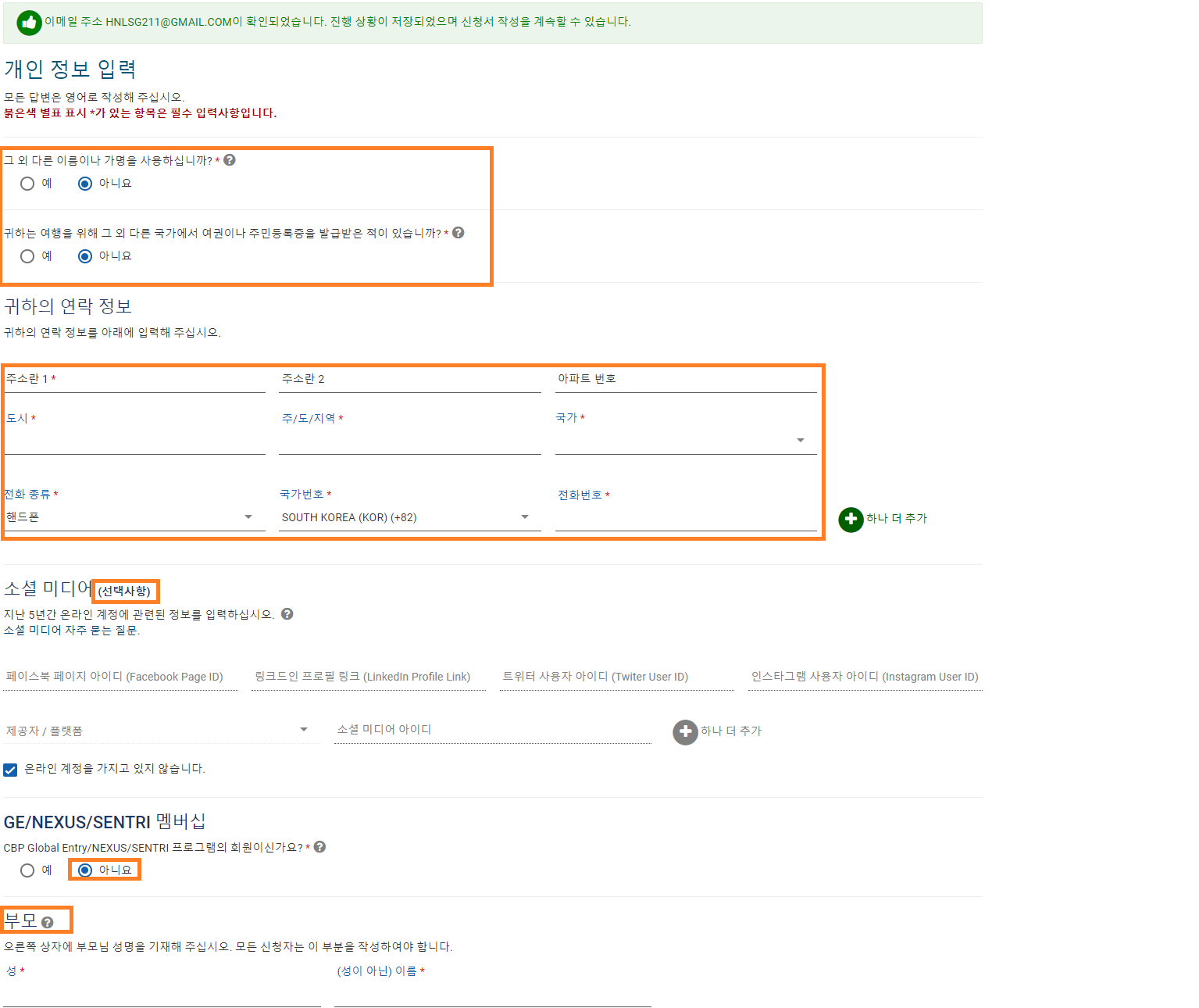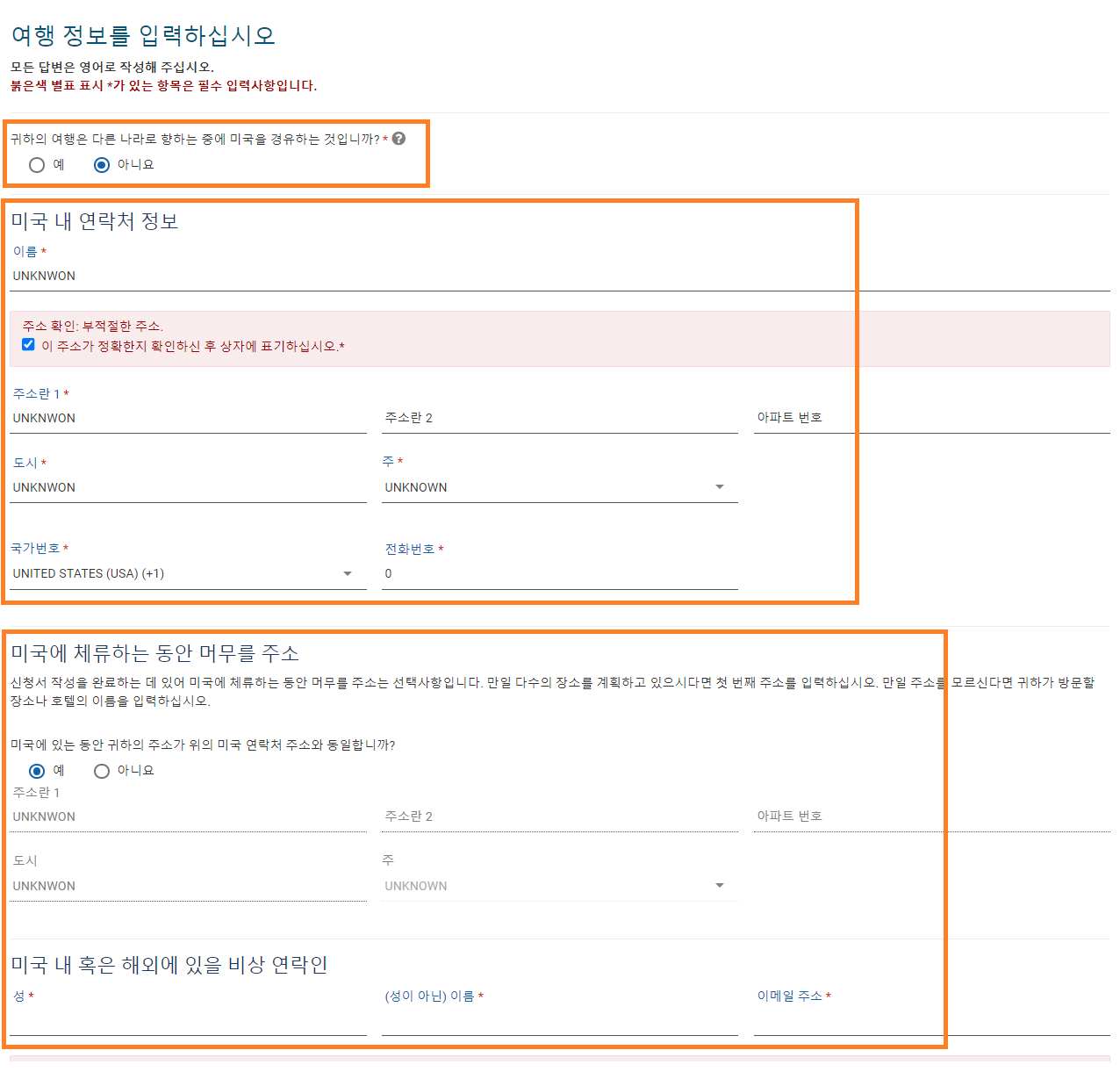 미국 내 연락처 정보를 모른다면 'UNKNWON'으로 모두 입력하고 전화번호는 '0'으로 입력합니다.