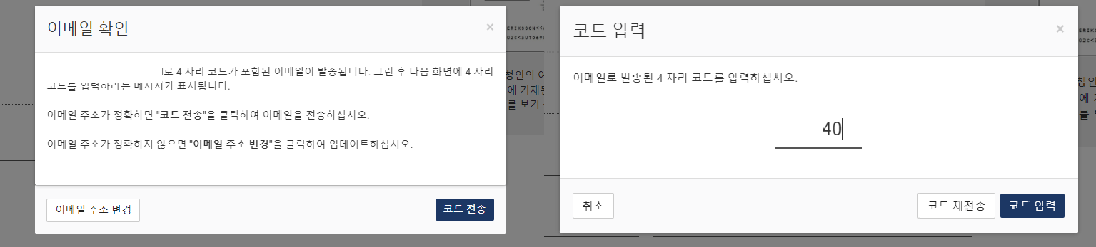2.4 다음으로 넘어가면 입력한 이메일로 코드(영문 숫자 포함 4자리)가 전송되고, 받은 코드를 입력합니다.