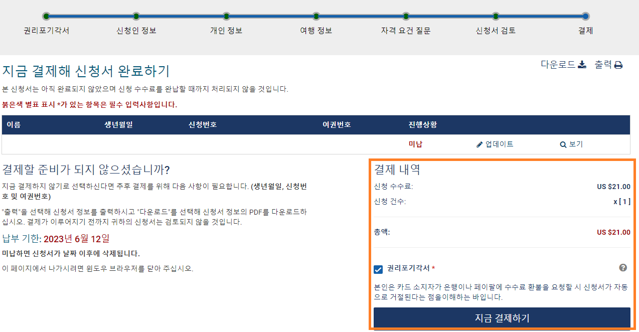 2.9 마지막 '결제해 신청서 완료하기'로 '권리포기각서' 체크 후 '지금 결제하기' 클릭