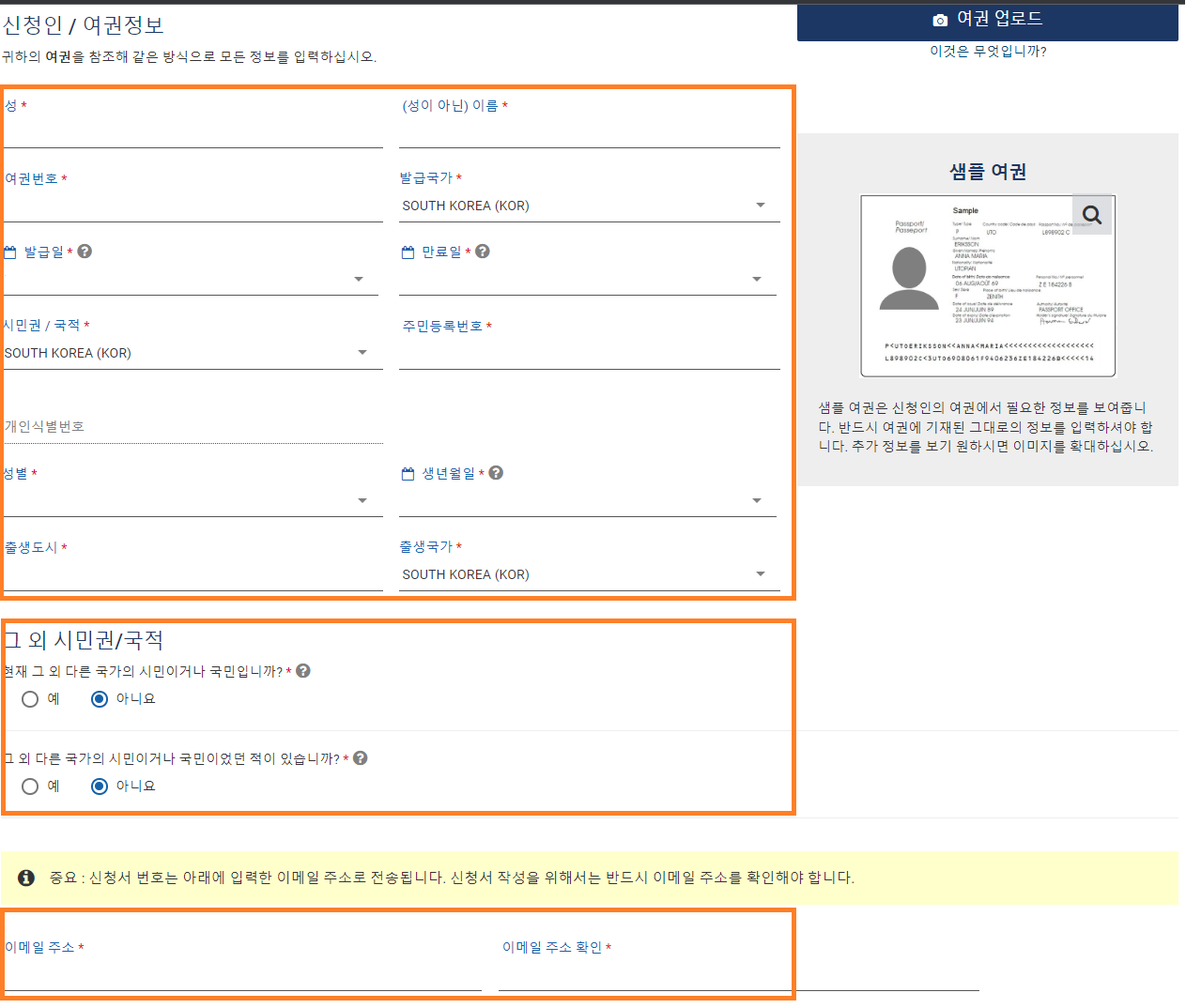 2.3 여권 업로드 또는 직접 정보를 입력하고, 마지막 이메일 정보를 입력하고