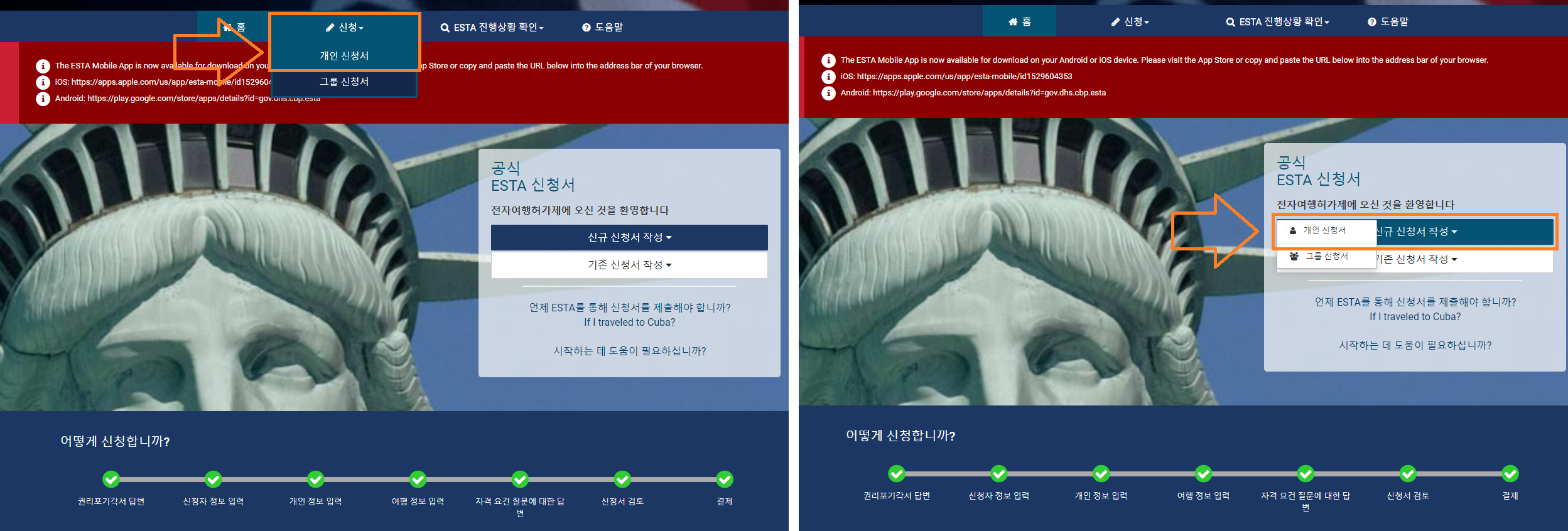 '공식 ESTA 신청서'에서 '신규 신청서 작성' -> '개인 신청서' 클릭