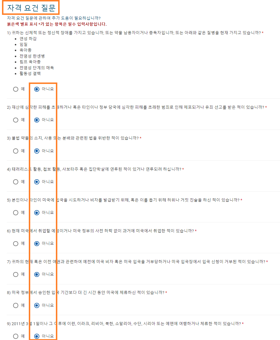 중요 부분으로 "예"가 하나라도 있으면 승인 거절사유가 됩니다.