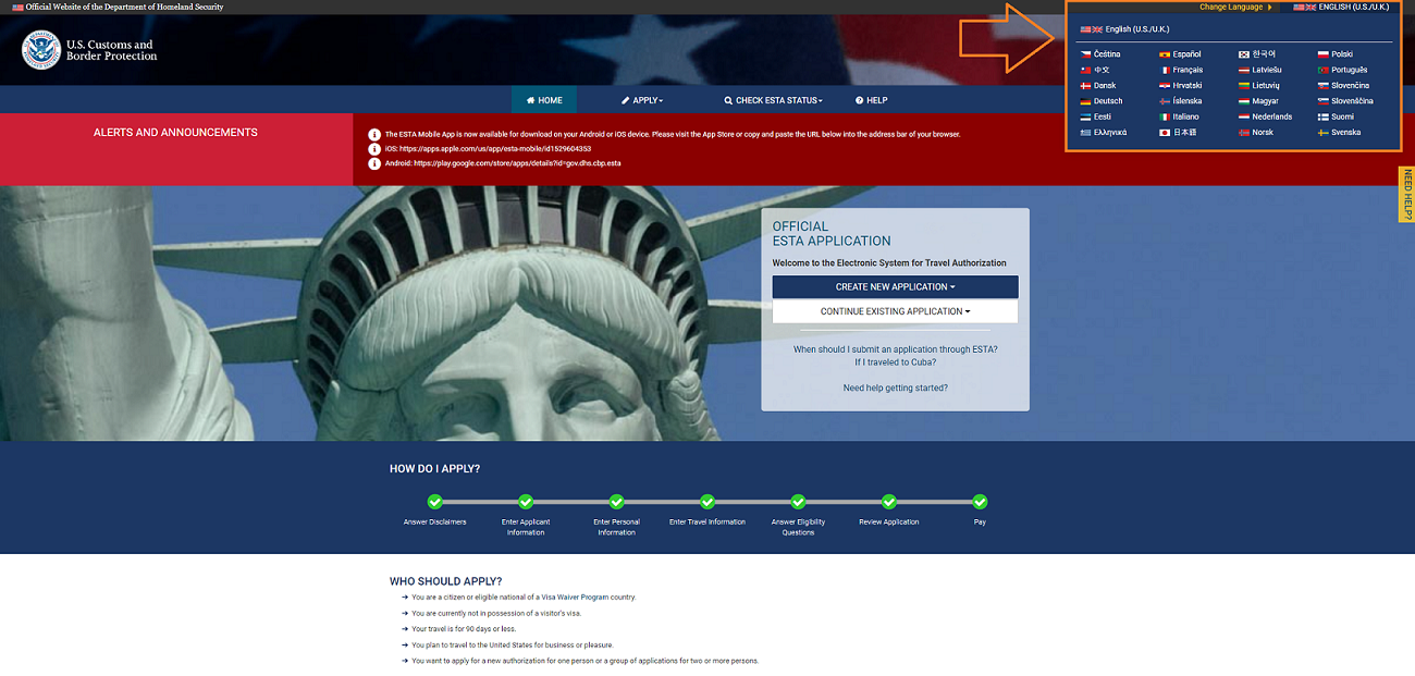 먼저, 미국 이민 세관국(United States Customs and Border Protection, CBP)의 공식 웹사이트로 이동하세요.