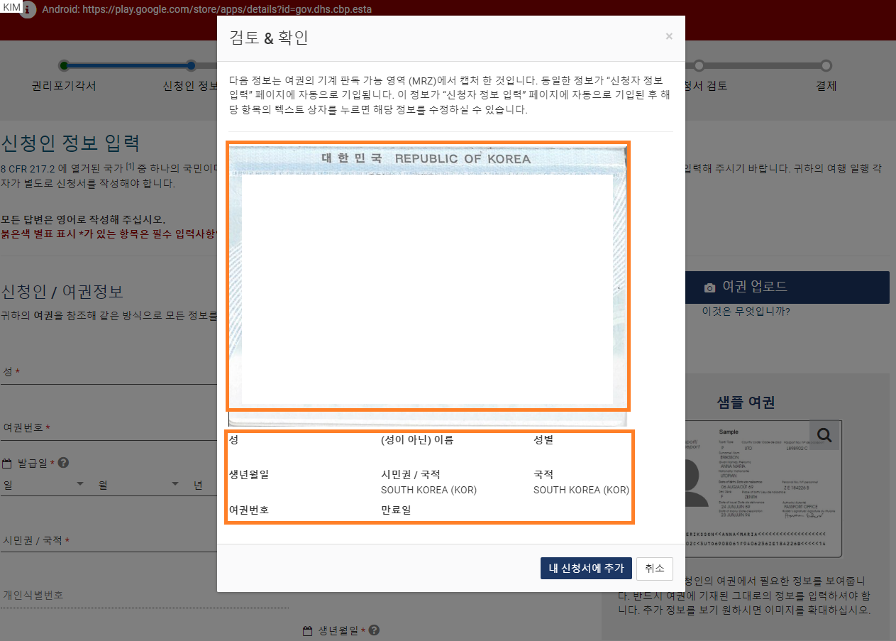 여권사진 업로드로 자동으로 정보를 인식해서 입력되는 편의기능으로,