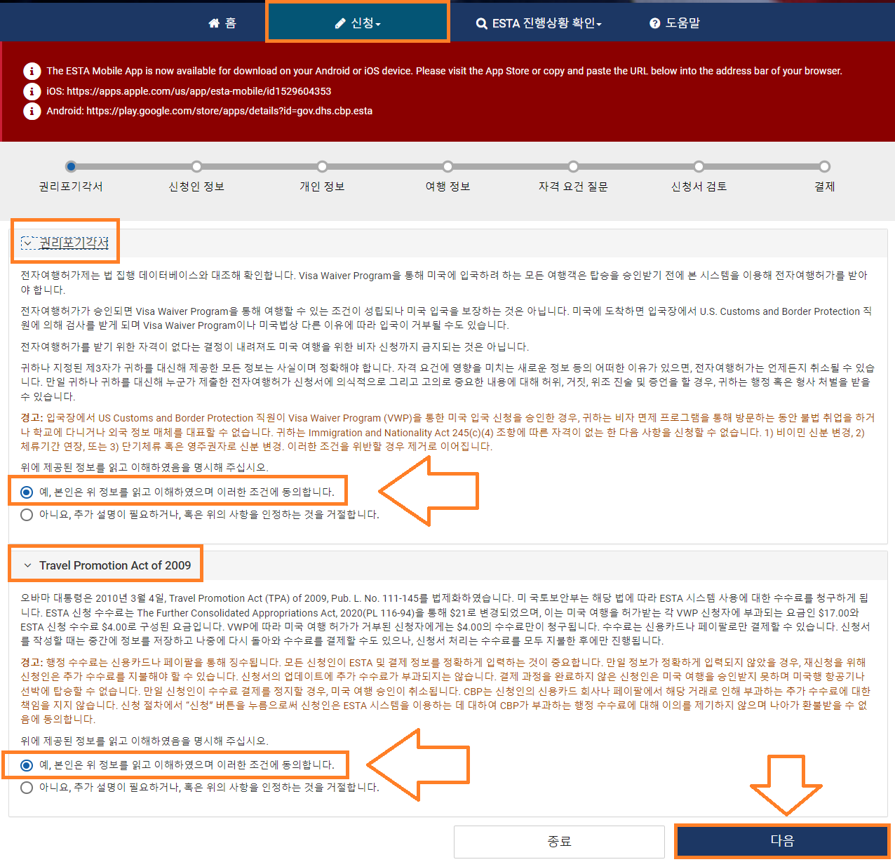 2.2 '권리포기각서'와 'Travel Promotion Act of 2009' 동의 후 '다음' 클릭