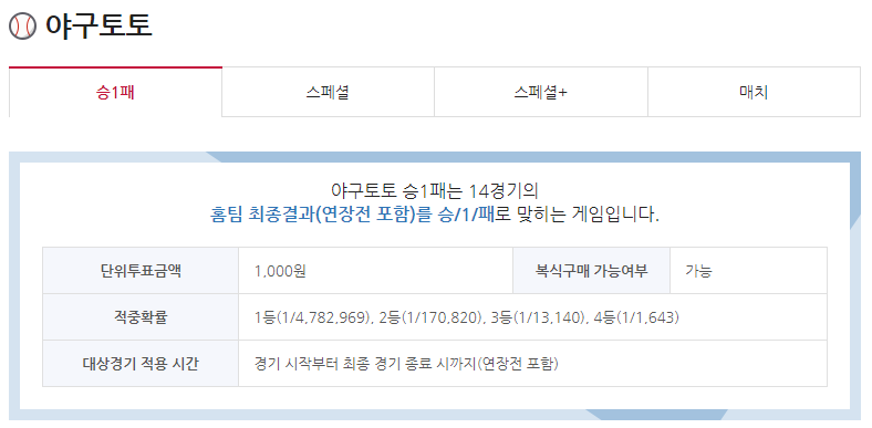 - 승1패 : 홈팀 최종결과(연장전 포함)를 승/1/패로 맞히는 게임(최소 금액 1,000원)