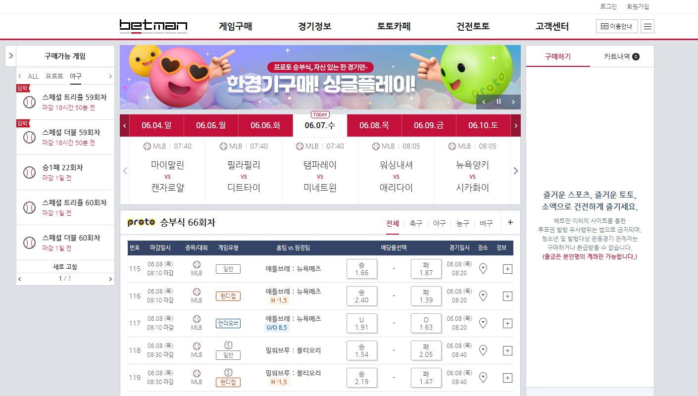 - 매치 : 홈런 유뮤와 최종 점수대(연장전 포함)를 맞히는 게임(최소 금액 100원)