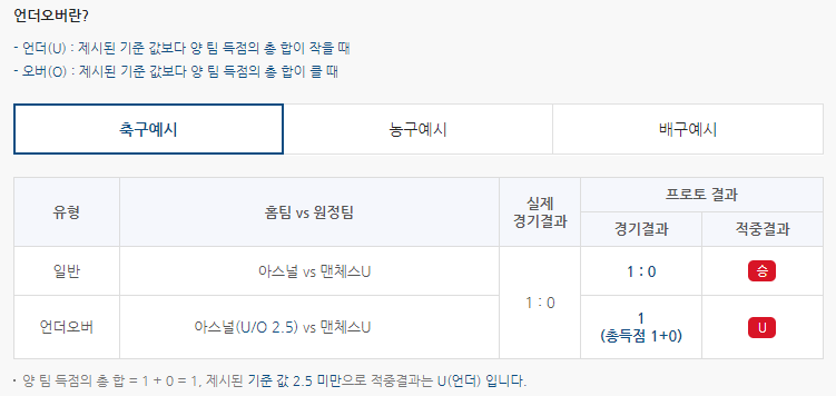 - 언더오버 유형 : 양팀 득점 총 합이 기준 값보다 작은지(언더[U]) 큰지(오버[O])를 맞히는 게임
