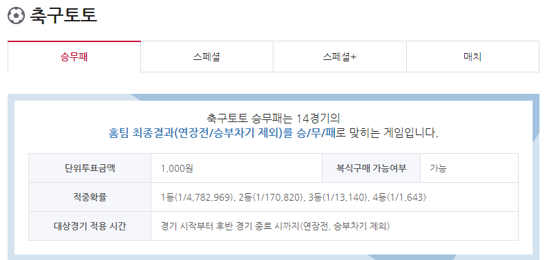 - 승무패 : 14경기의 홈팀 최종결과(연장전/승부차기 제외)를 승/무/패로 맞히는 게임(최소 금액 1,000원)