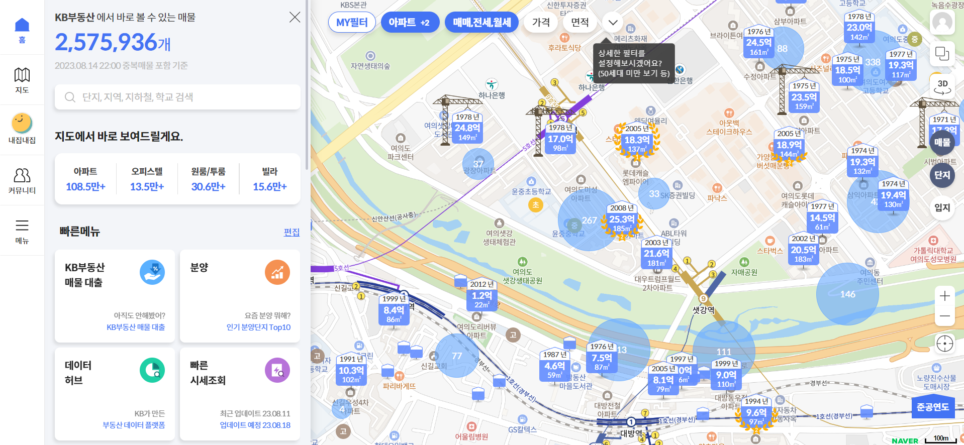 KB부동산은 아파트, 오피스텔, 원룸/투룸, 빌라 매물수에 대한 변화와 정보가 실시간으로 업데이트 되며, 부동산 대출, 분양정보, 시세조회 등을 홈페이지나 어플을 통해 손쉽게 확인할 수 있는 장점이 있으며, 앞에서 설명드린 어플과 비슷한 성격의 기능을 고루 갖춘 어플로 요즘 유튜브나 언론 기사에서 KB 부동산 데이터를 자주 인용하는 것을 보아 신뢰성 있는 데이터 수집과 분석을 하고 있는 것으로 볼 수 있어 부동산 매매를 고려 중이신 분들에게 도움이 될 어플로 생각됩니다.
