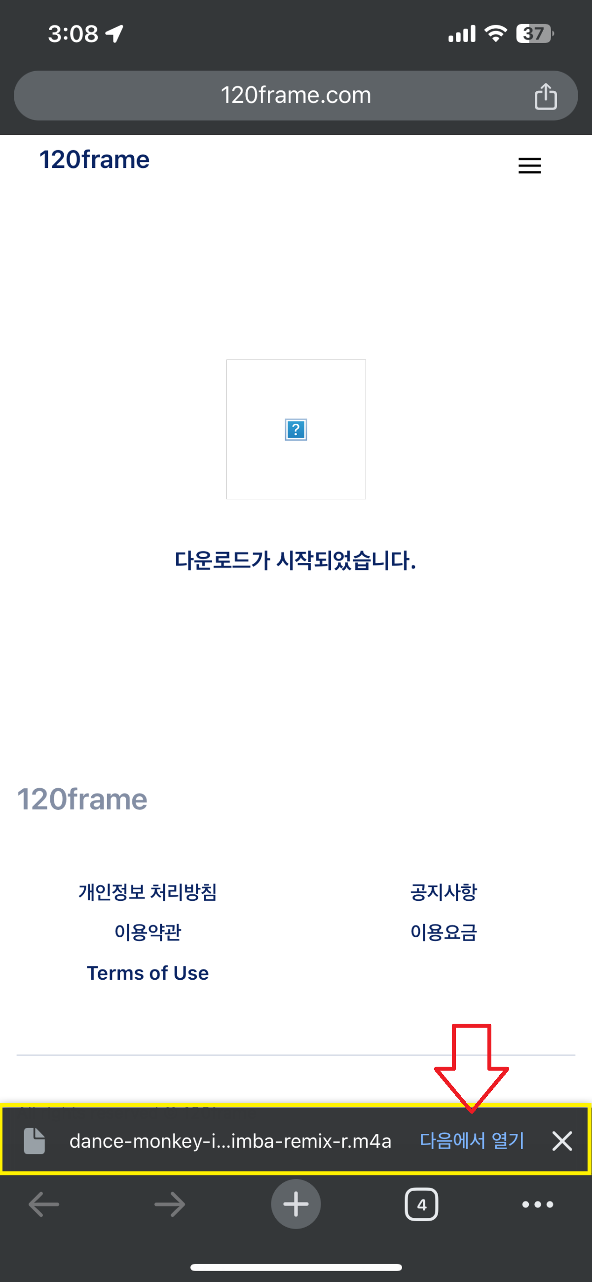 1.7 다운로드를 누르면 화면 하단에 알림이 뜨고 여기서 '다음에서 열기' > '파일에 저장'을 누른 다음 다시 저장하려는 위치에서 저장을 눌러줍니다.