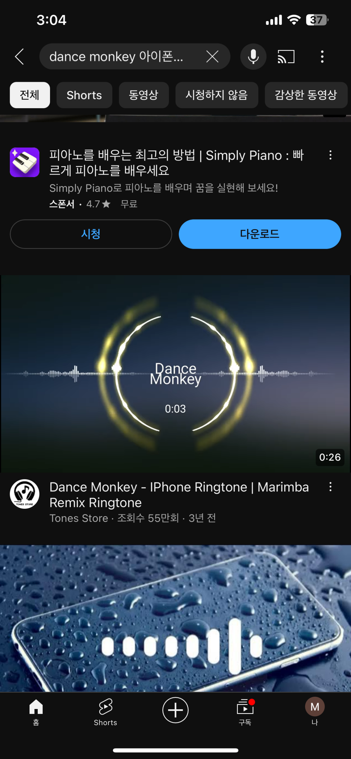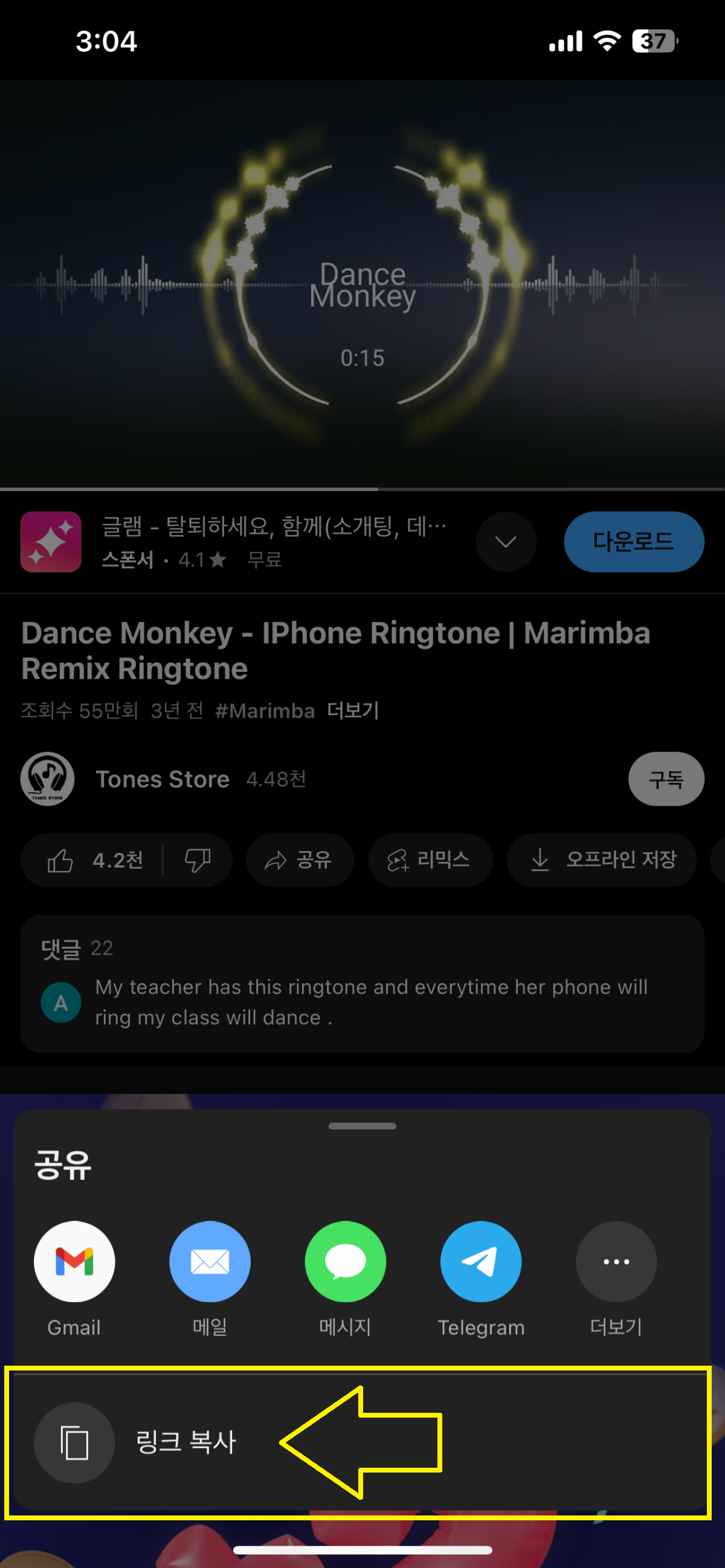 1.3 예시로 유튜브 검색창에 'Dance Monkey 아이폰 벨소리'로 검색하여 들어간 후 '좋아요' 버튼 오르쪽에 '공유' 버튼을 눌러 링크저장을 해줍니다.