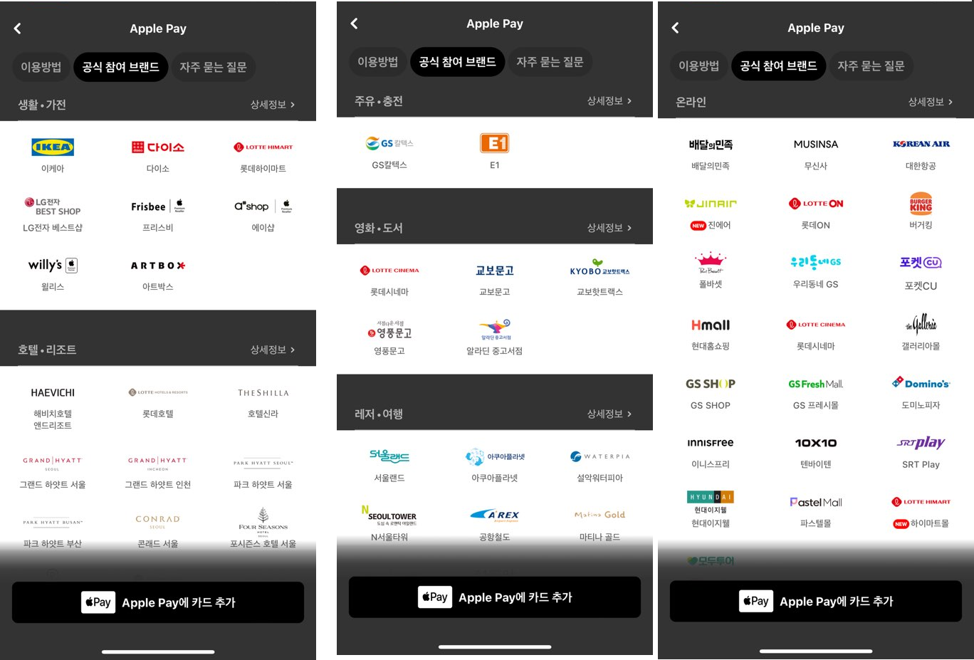 - 공식 참여 브랜드는 편의점, 백화점·쇼핑, 마트·슈퍼, 제과·디저트, 생활·가전, 주유·충전, 온라인으로 잘 알려진 프랜차이즈 가맹점은 애플페이가 가능합니다.