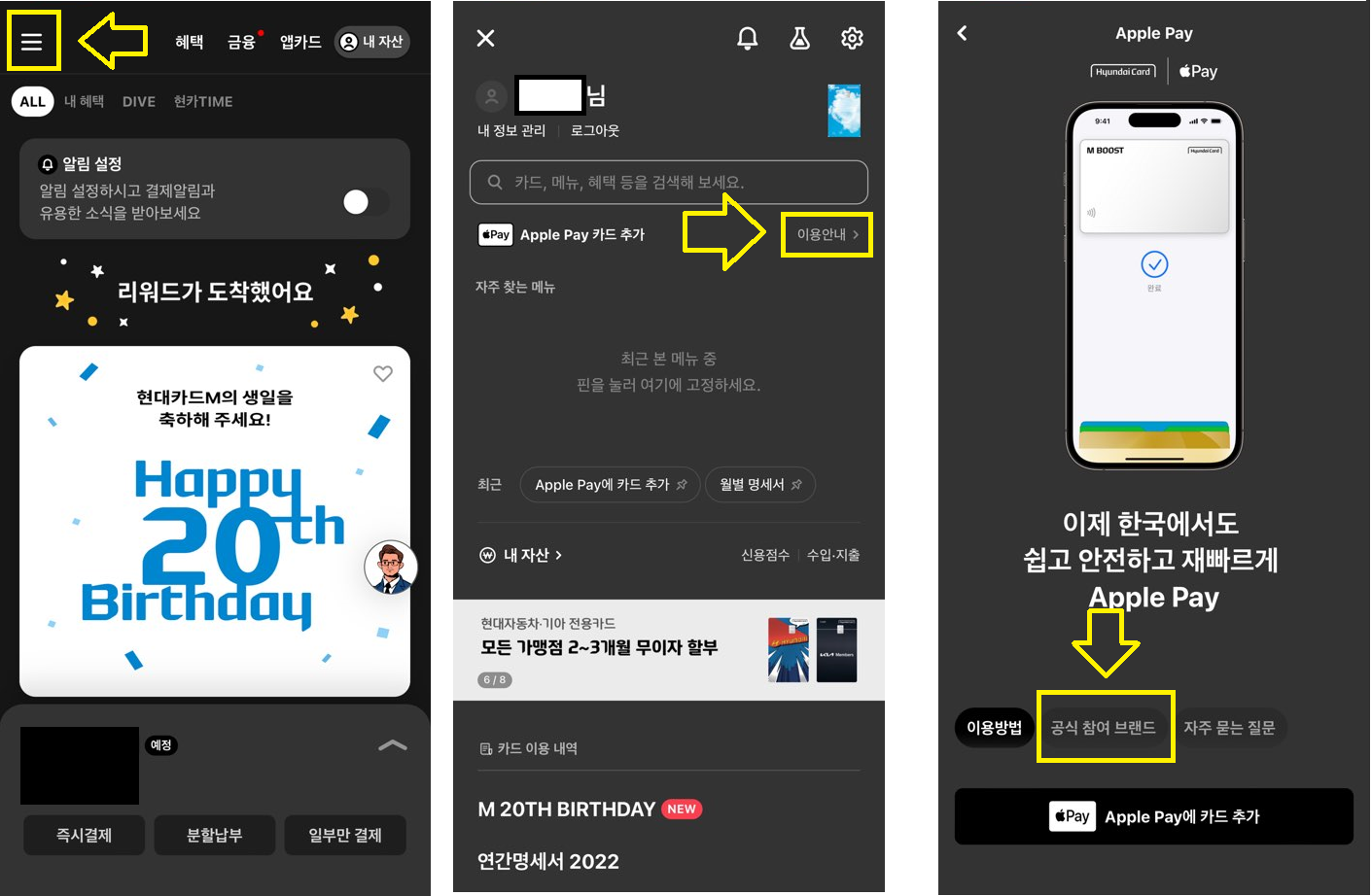 2) 현대카드 앱에서 '애플페이 공식 참여 브랜드' 확인하기