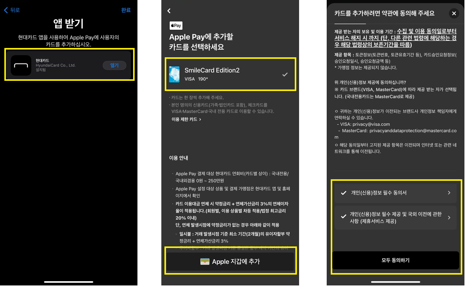 7) 만약 여러 장의 현대카드가 있다면, 등록하려는 카드를 선택한 후 'Apple 지갑에 추가'를 선택하고