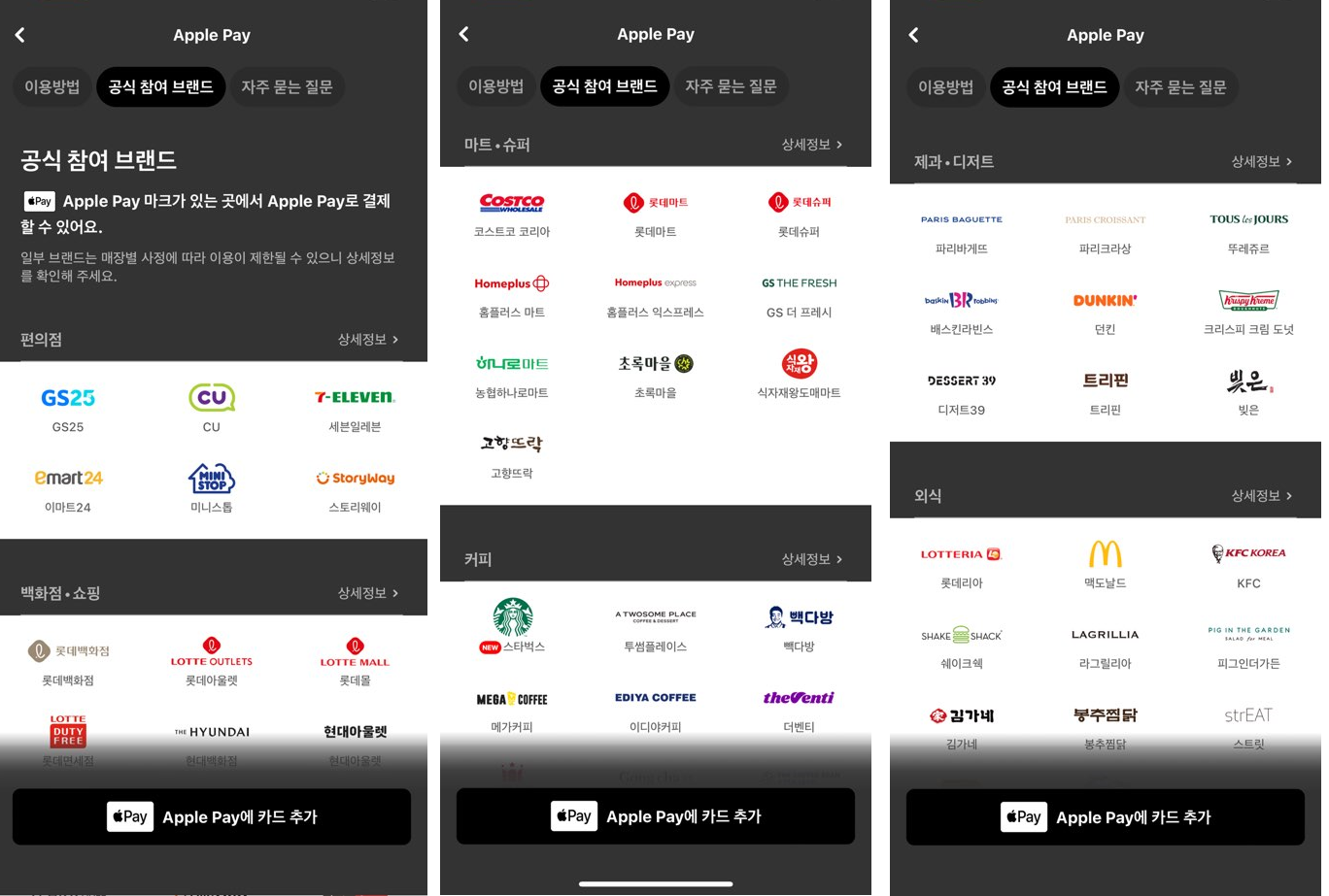 - 공식 참여 브랜드는 편의점, 백화점·쇼핑, 마트·슈퍼, 제과·디저트, 생활·가전, 주유·충전, 온라인으로 잘 알려진 프랜차이즈 가맹점은 애플페이가 가능합니다.