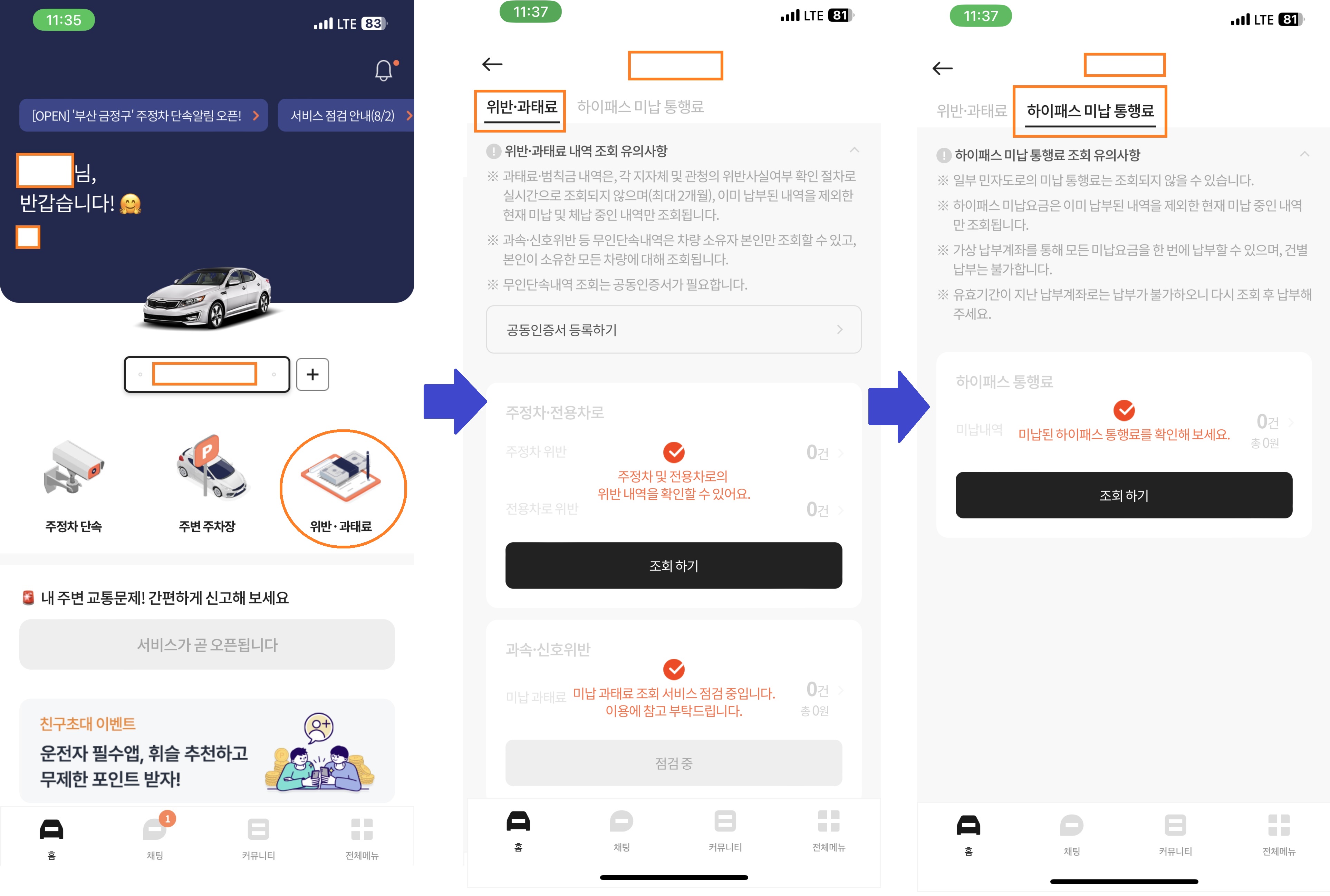 2.3 주변 주차장 찾기, 교통위반 조회, 하이패스 미납 통행료 납부