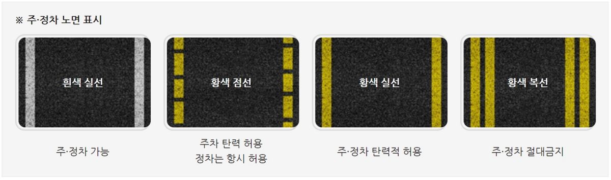 흰색 실선에서는 주정차가 가능하고, 황색 점선/실선/복선에 따라 과태료 부과 기준이 다르니 꼭 확인해야합니다.