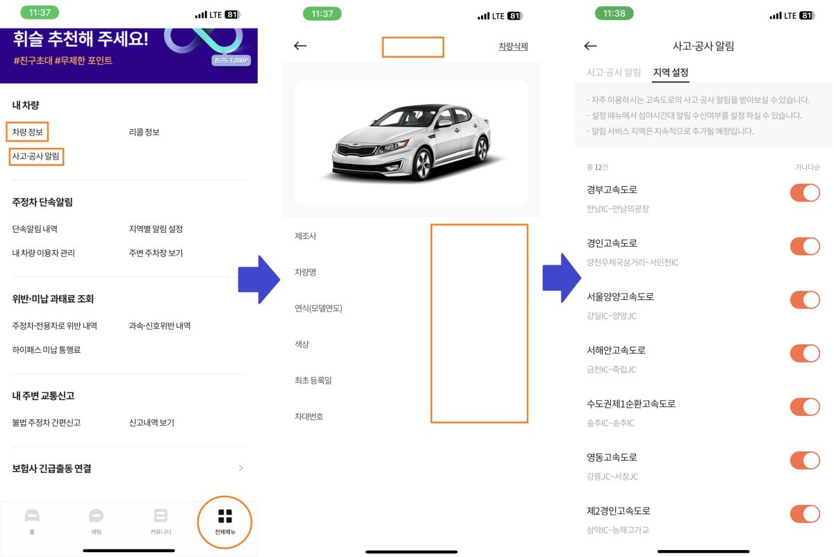 차량등록을 통해 내 차량의 세부 정보와 실시간 고속도로 사고와 공사 알림 서비스도 이용 가능합니다.
