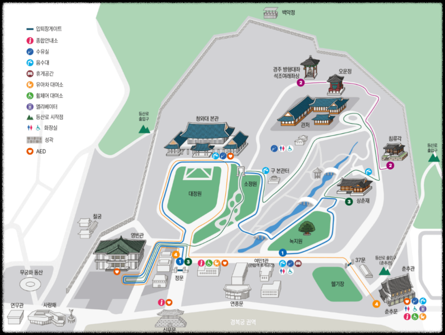 영빈관 →청와대 본관 →구 본관 터 → 관저 →오운정 →상춘재 → 녹지원 →헬기장 순으로 관람 추천 - 춘추문을 통해 입장하신 경우