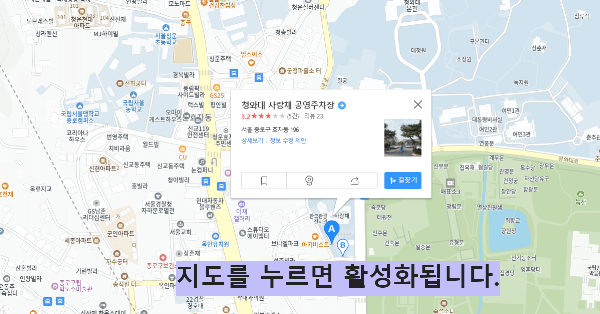 - 청와대와 경복궁 근처 사설 주차장은 요금이 비싸 가급적 피하시는 것을 추천드립니다.